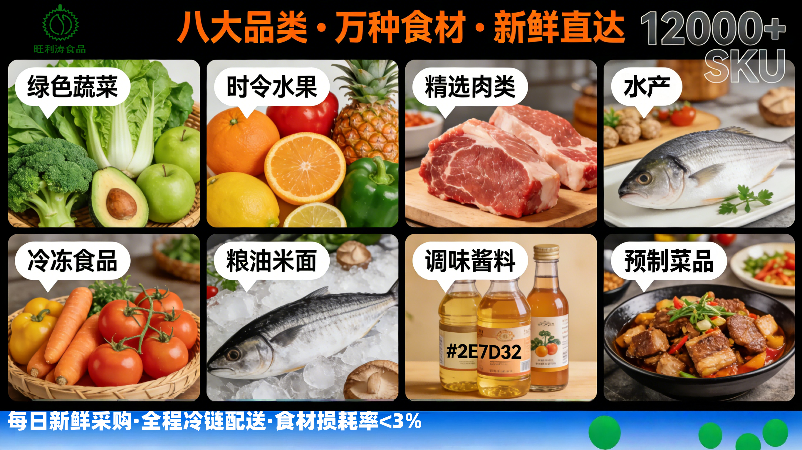 在产品特点方面,旺利涛食品品类丰富多样,覆盖蔬菜、水果、肉类、水产、禽蛋、粮油、调味品、预制菜八大类超12000个SKU,能够满足客户一站式采购需求。客户无需对接多家供应商,大大提高了采购效率,解决了采购渠道分散、需对接多家供应商的用户痛点。此外,公司采用先进的冷链物流技术和设备以及专业的配送团队和完善的物流体系,实现快速、准确的配送服务,进一步保障了食材的新鲜度。并且公司严格把控食材质量,确保所有产品均符合食品安全标准,食材来源可追溯,让客户能够放心采购。